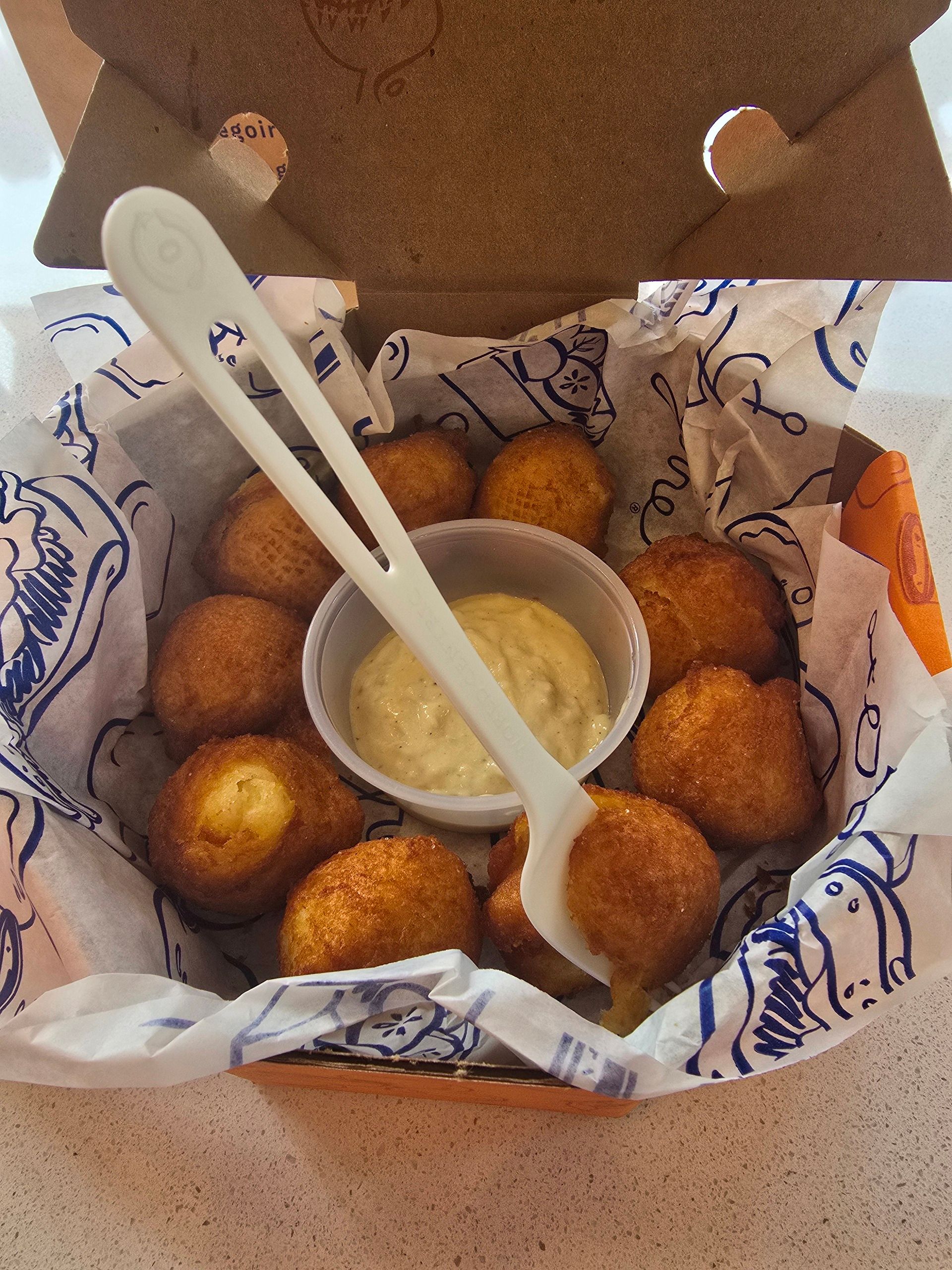 I stopped by this past Saturday, on day two of Grégoire’s soft opening, hoping to get in early to try those famous potato puffs. Chef Grégoire himself was there managing the line out front and getting his staff ready on the line in back. Inside, the space was bright and clean, with counter seating and a few tables outside for dining. The streamlined menu featured a handful of sandwich options, salads, soups, potato puffs, housemade French fries, and two choices of sweets. I noticed many patrons opting for the fried buttermilk chicken filet with spicy coleslaw on a French roll. I ordered a roasted pumpkin soup ($5.60) and, of course, an order of the potato puffs with housemade garlic aioli ($8.85).