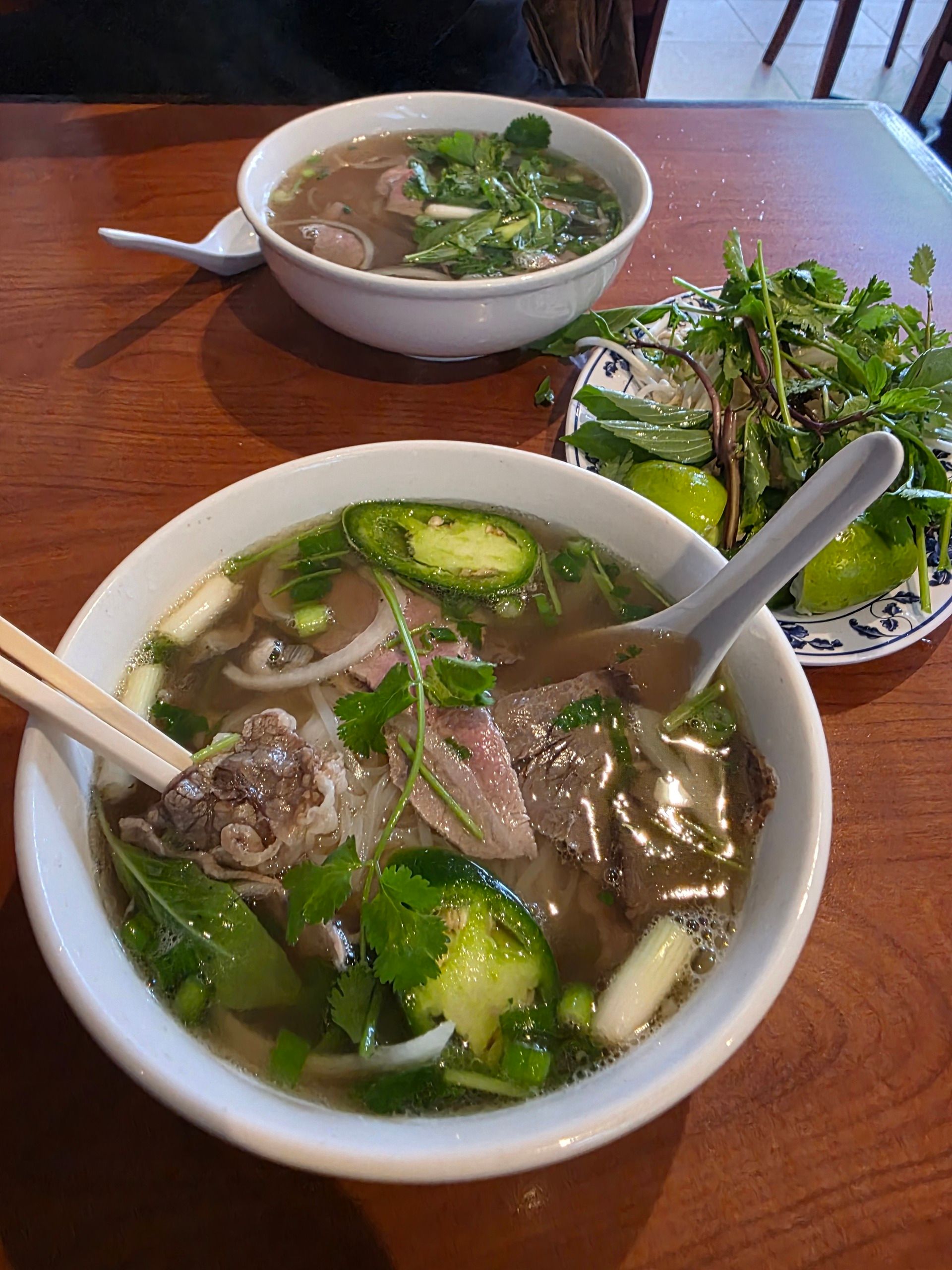 Choosing a favorite pho restaurant is a very personal thing. For me, it’s all about the broth. I want a rich, deep flavor with ginger and onion, toasted spices, and a balanced flavor that leans more savory than sweet. Nothing is more disappointing than a weak, wimpy broth. My current neighborhood go-to is Pho Huynh Sang on Clement Street, which delivers a dependable bowl that always delivers on broth flavor. A bonus: they offer the option of thick noodles.